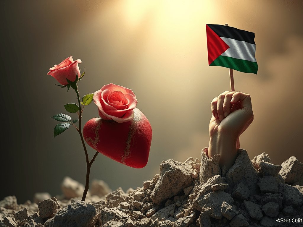 The rubble is not just destruction—it’s the soil from which memory and defiance grow. The hand is not just grasping—it’s lifting, reclaiming, insisting on being seen.